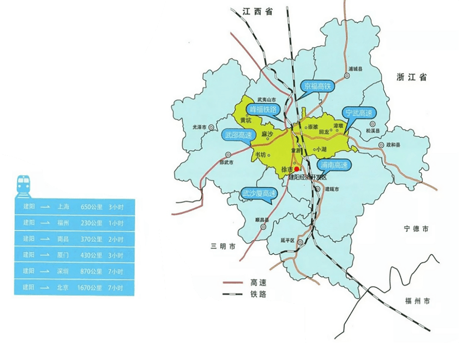 建陽是交通便捷的區(qū)位經(jīng)濟中心。地處閩北中心,北距“雙世遺”武夷山風景區(qū)40公里,與南平市下轄十個縣(市、區(qū))除延平區(qū)外的八個縣(市)接壤。規(guī)劃建設(shè)中的武夷新區(qū)與建陽城區(qū)毗鄰,是一座容納60萬人口的閩北新興中心城市。